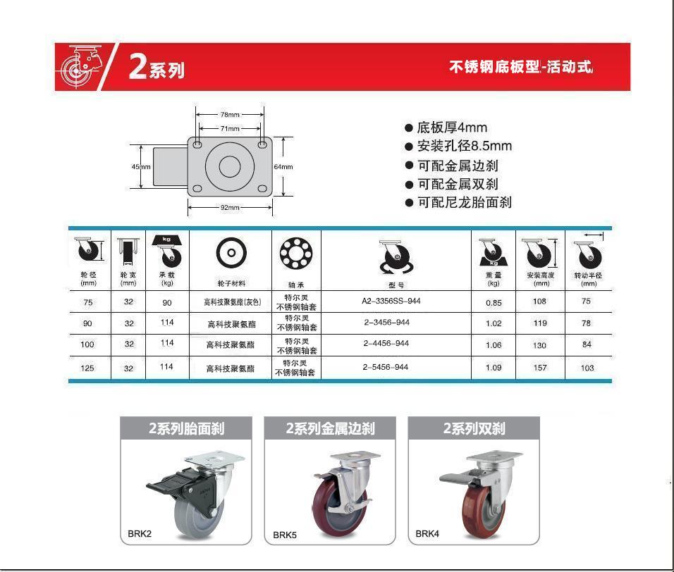名    称: 中型不锈钢聚氨酯万向