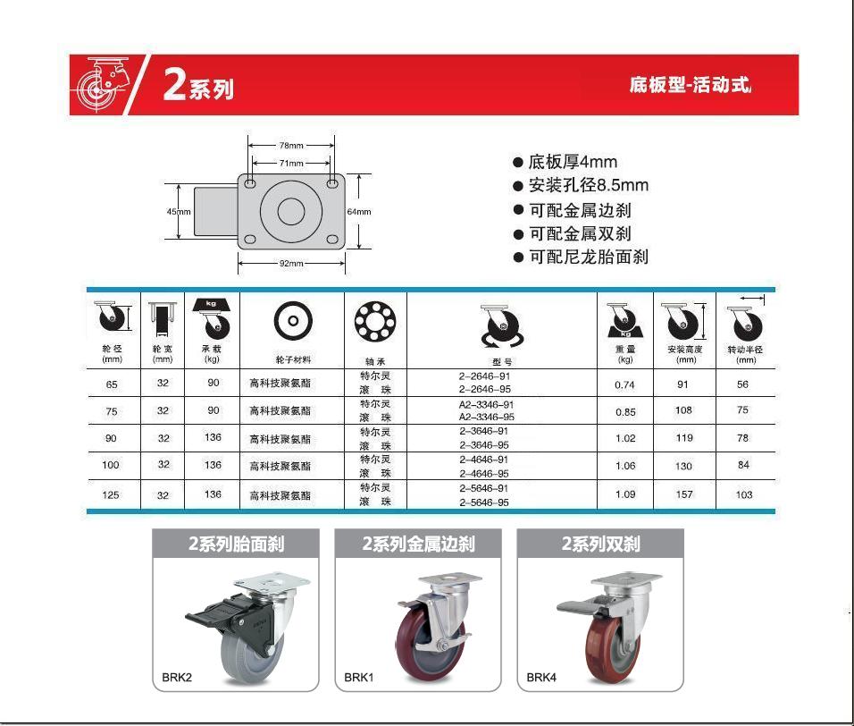 轮    径: 2.5寸65mm)、3寸(75mm)、3.5寸(90mm)、4寸(100mm)、5寸(125mm)、