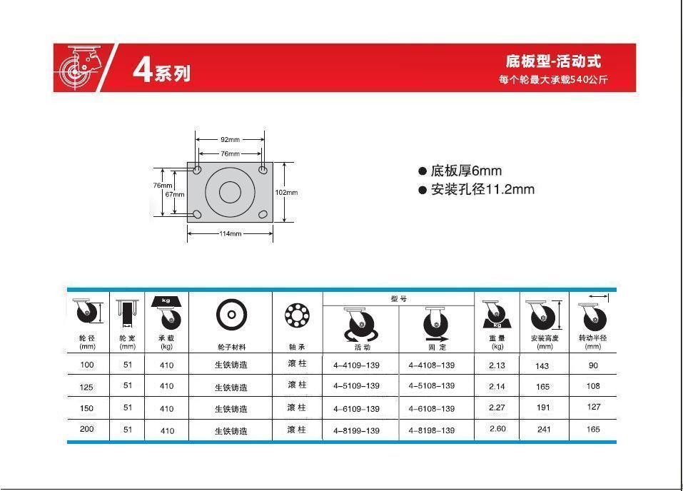 | 轮 径: | 4寸(100mm)、5寸(125mm)、6寸(150mm)、8寸(200mm)、 |