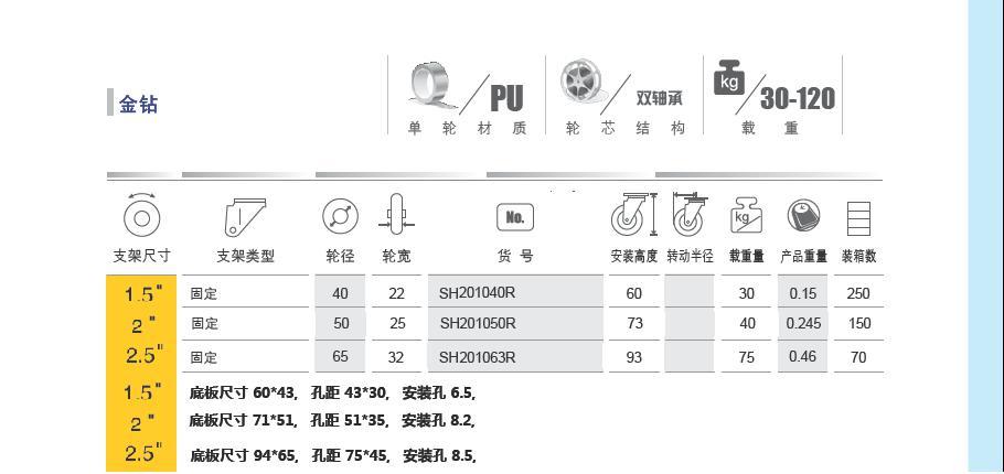 | 轮 径: | 1.5寸(38mm)、2寸(50mm)、2.5寸(63mm) |