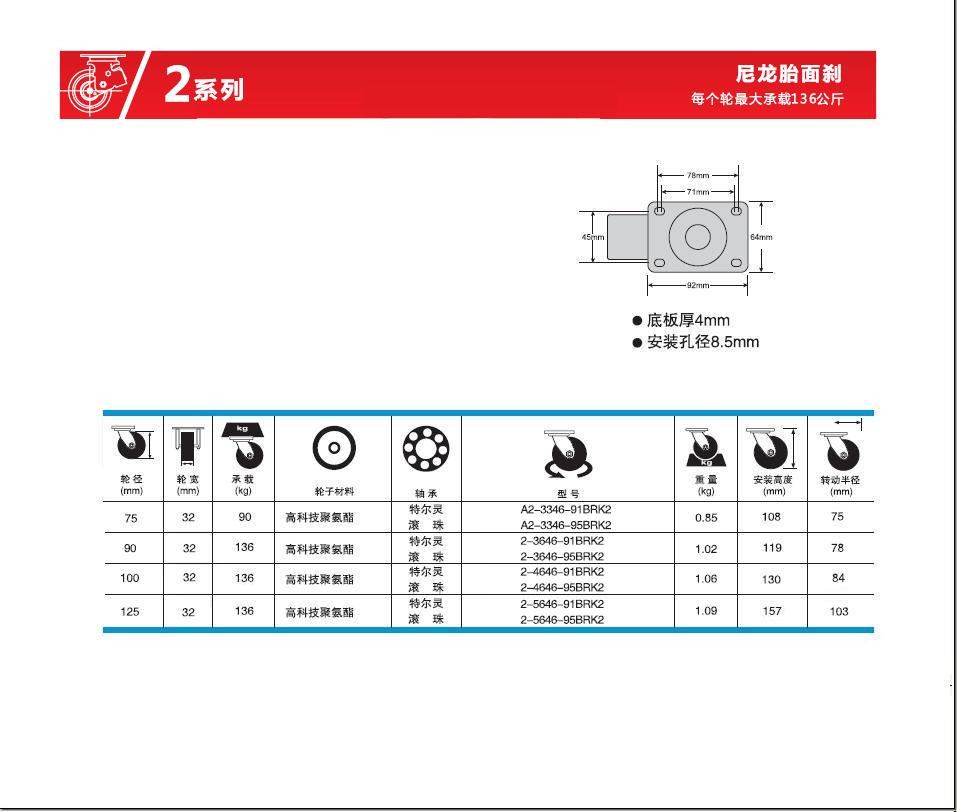 | 轮 径: | 3寸(75mm)、3.5寸(90mm)、4寸(100mm)、5寸(125mm)、 |