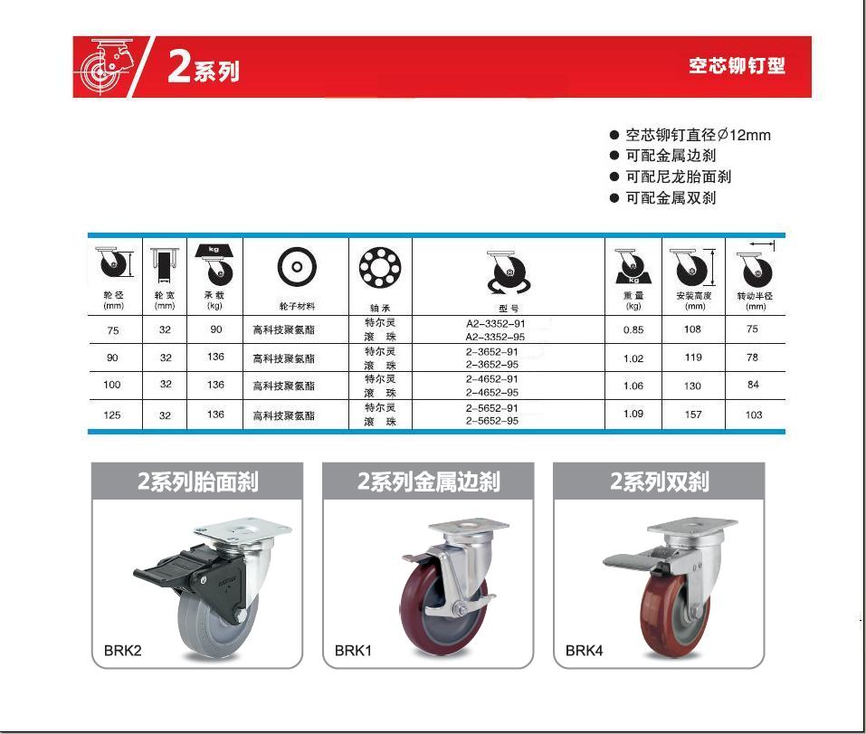 | 轮 径: | 3寸(75mm)、3.5寸(90mm)、4寸(100mm)、5寸(125mm)、 |