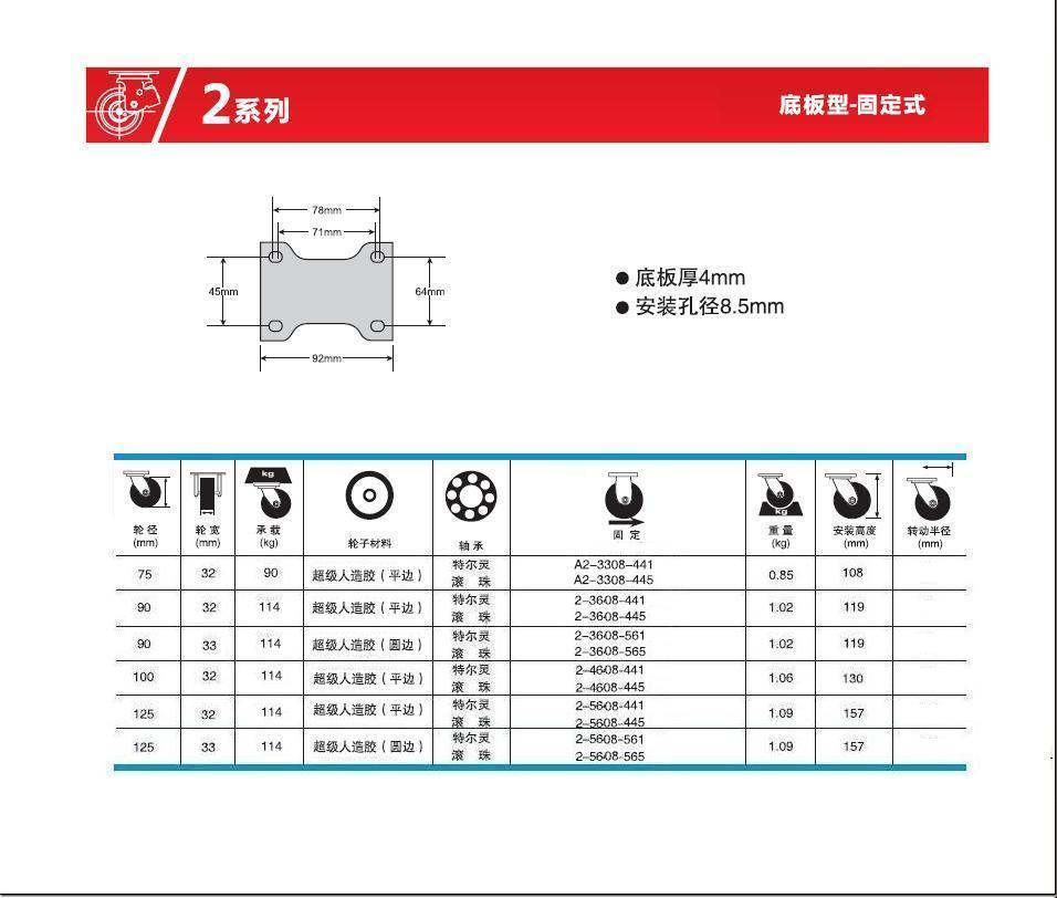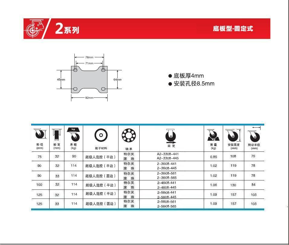 | 轮 径: | 2.5寸65mm)、3寸(75mm)、3.5寸(90mm)、4寸(100mm)、5寸(125mm) |