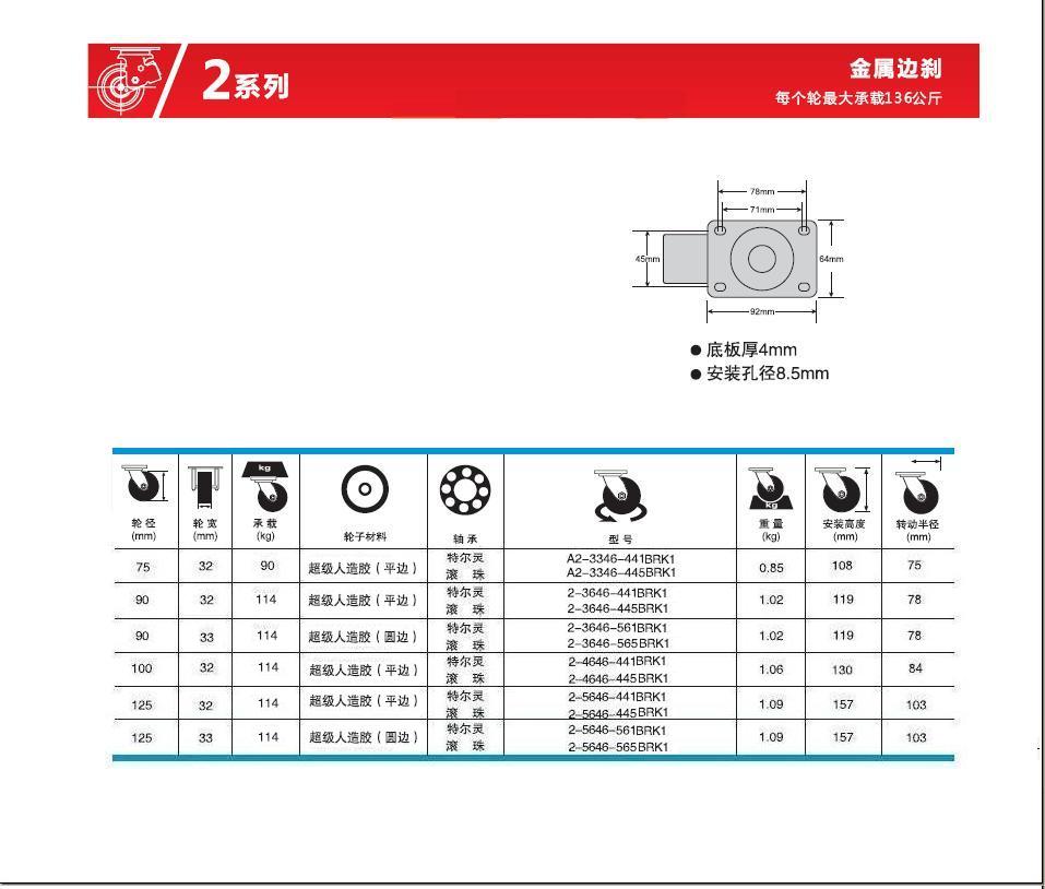| 轮 径: | 3寸(75mm)、3.5寸(90mm)、4寸(100mm)、5寸(125mm)、 |