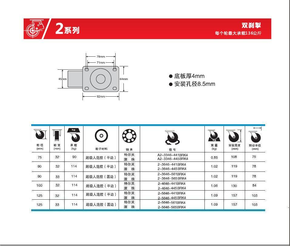 | 轮 径: | 3寸(75mm)、3.5寸(90mm)、4寸(100mm)、5寸(125mm)、 |