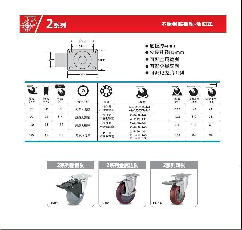 | 类 型: | 不锈钢脚轮(80-450Kg) |