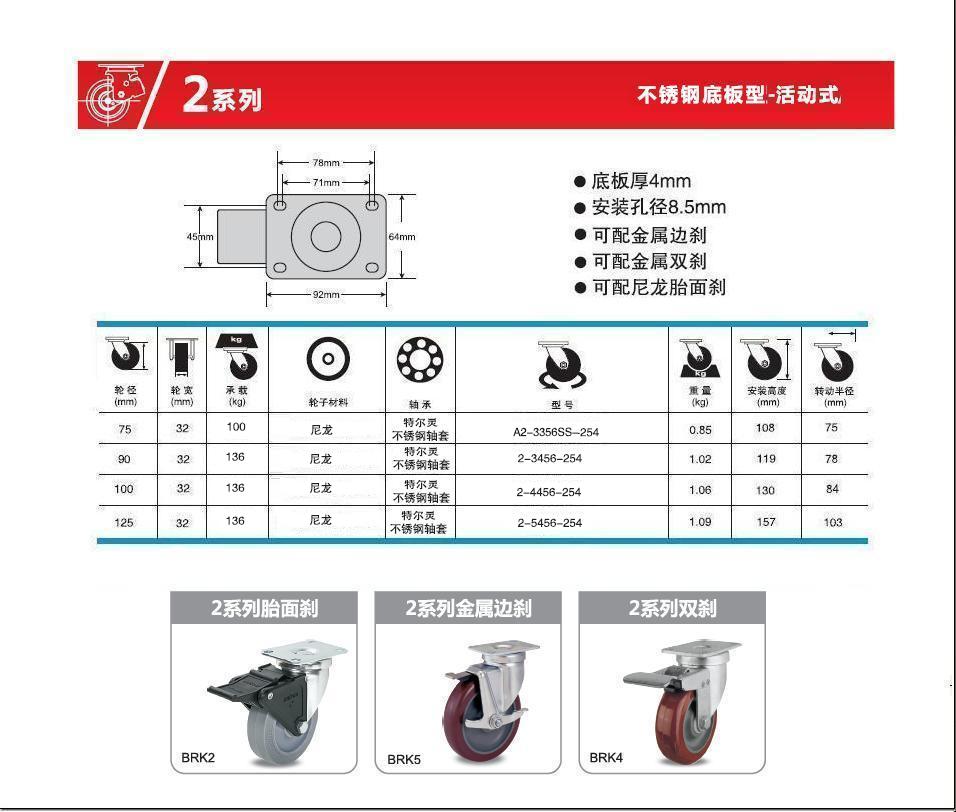 | 类 型: | 不锈钢脚轮(80-450Kg) |